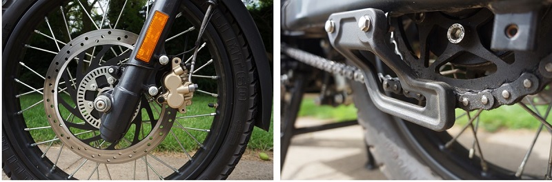 The disc brakes at both ends are just OK, but they are progressive and have pleasant feel. The calipers themselves are from an Indian subsidiary of Brembo. ABS cannot be switched off but it doesn’t seem overly sophisticated and does permit quite a lot of skidding from the rear which is good, enabling reasonable control on loose descents.